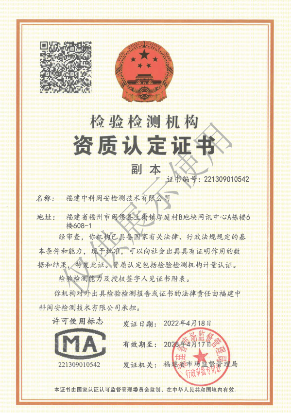 福建中科闽安检测技术有限公司,坐落于福州市闽侯县高新区内。经福建省市场监督局批准,具备CMA检测资质,可委托出具具有法律效力CMA许可的软件、智能化、安防、机房等检测报告。证号:221309010542是一家集检验检测、认证鉴定、技术服务、咨询培训为一体的综合性公共服务机构。目前已获得四百多项认可的能力范围,通过了ISO9001质量管理体系认证,并拥有自主产权的知识产权8份。